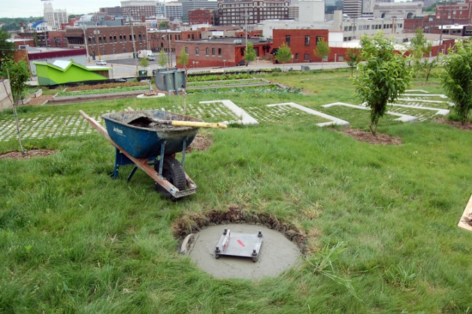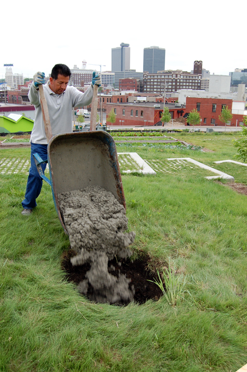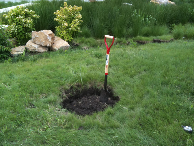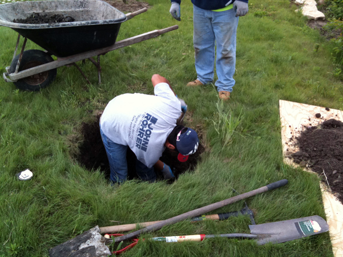 On a cold and misty day we finally begin digging the hole for the substantial concrete footing required for the post.