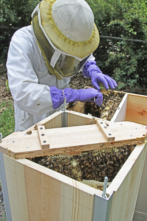 Brad ties on extra piece of comb to an edge of the frame that has some free space. Later the bees will secure this with wax and remove the string themselves.