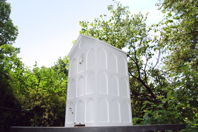 The bees are in their new home and ready for installation on the post. I have noticed that now that the weather is hot the bees are perched on their font porch fanning the fresh air through their hive. I held a thin piece of tissue paper near the bottom hole and could see it blowing away from the entrance and when I held it near the upper hole the draft sucked it it. The double entrance seems to work well for circulating fresh air through the hive. This should enable them to keep the hive cool in the summer as well as to keep the humidity they generate in the winter from building up and condensing inside the hive, causing moisture problems.