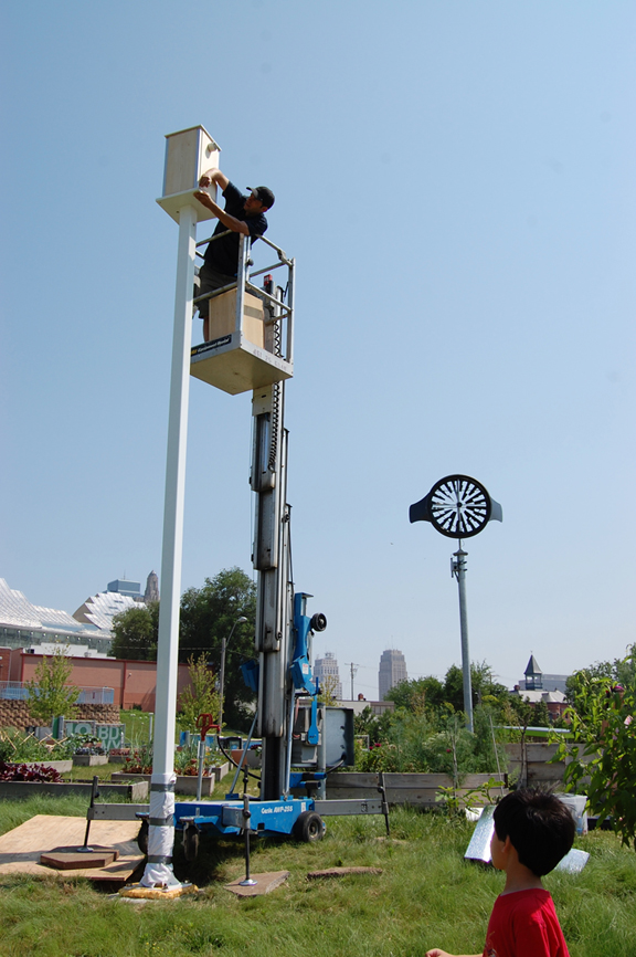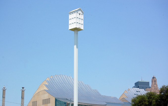 Monday June 7 marks the first installation of this sculpture series. It was 97 degrees and sunny and the bees weren’t happy waiting in my truck (I had the air conditioner running) but now they are finally settled at their new site. They have the city’s best view of the new Kauffman Performing Arts Center. Feel free to stop by and visit anytime.