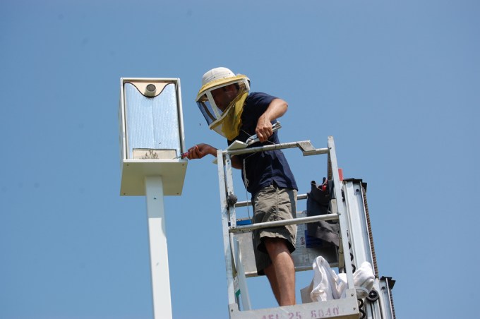 It was a hot day and at first I resisted wearing my suit but the bees were a little upset after being cooped up in their hive and driven across town. Better safe than sorry, especially at this height.